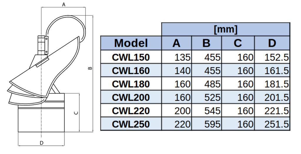CWL200 – Roterande skorsten hat designad för att skydda skorstenen mot ogynnsamma väderförhållanden och förbättra drag effektivitet med 360° rotationskapacitet.